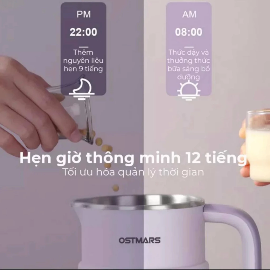» Hẹn giờ nấu lên đến 12 giờ: tính năng này cho phép người dùng ngâm sẵn nguyên liệu và hẹn giờ máy làm sữa thành phẩm. Điều này rất tiện lợi cho những người bận rộn và giúp tiết kiệm thời gian trong việc chuẩn bị sữa.