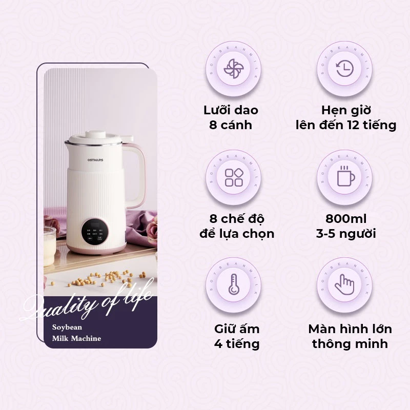 » 8 chế độ nấu tự động: máy làm sữa hạt OSTMARS có 8 chế độ nấu tự động bao gồm nấu cháo, nấu nước, trà, sinh tố, làm sữa với các loại hạt dinh dưỡng khác nhau, giúp cho việc sử dụng sản phẩm trở nên đa dạng và tiện lợi hơn.