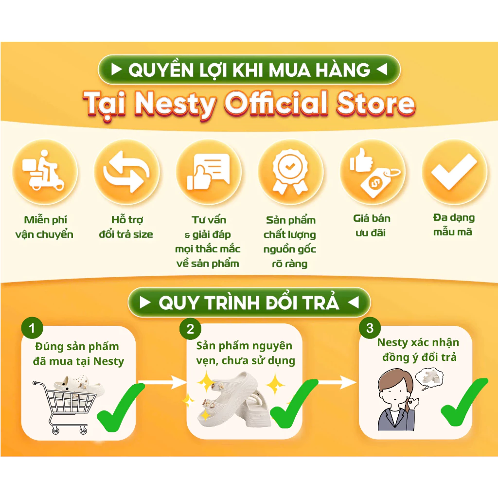 Đổi size trong 7 ngày. Lỗi NSX 1 đổi 1. Không áp dụng cho trầy sước, mòn đế, nóng chảy, thú vật cắn, Đâm thủng.