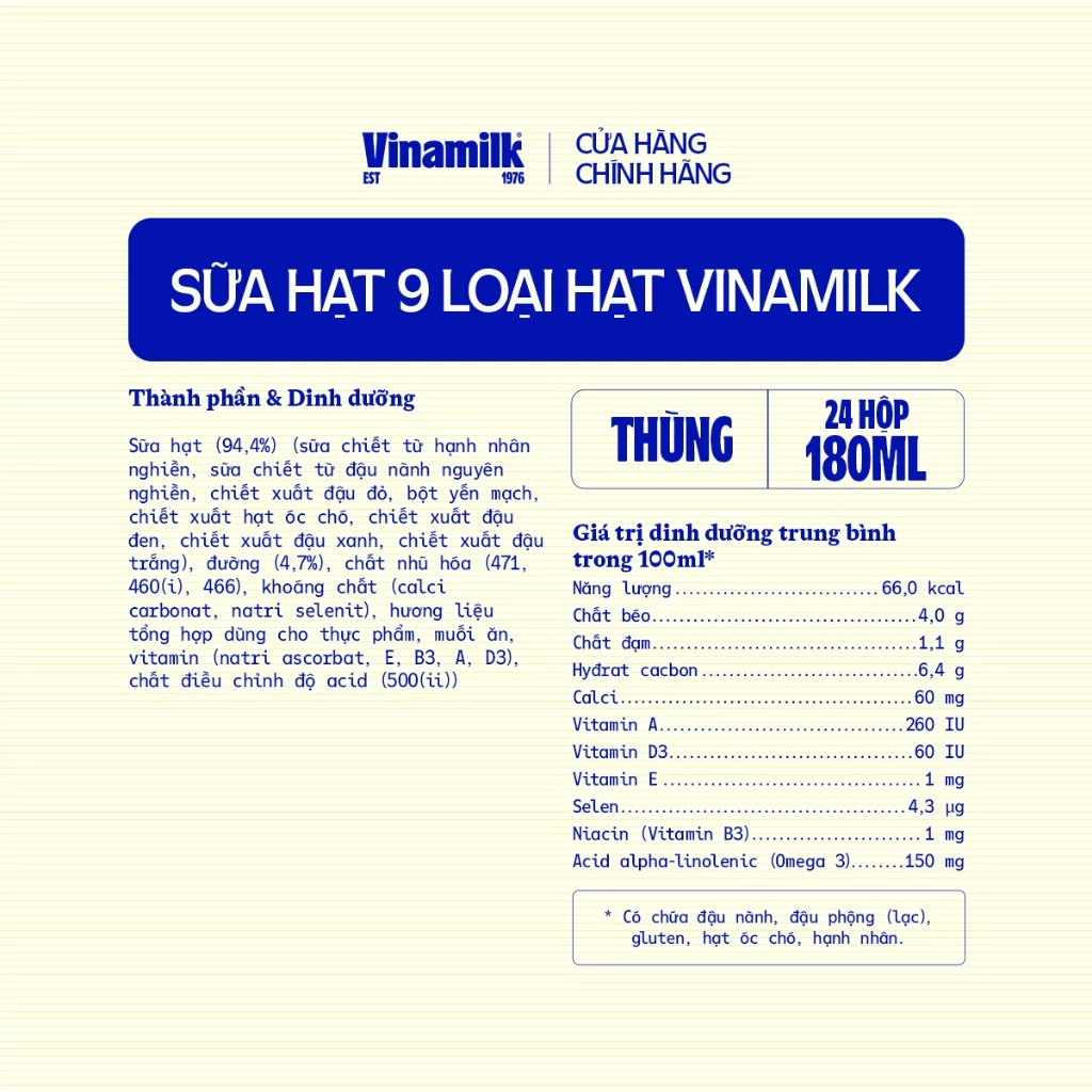 Sữa hạt 9 loại hạt Vinamilk ít đường, kết hợp từ 9 loại hạt thượng hạng (hạnh nhân, óc chó, yến mạch, đậu nành, đậu đỏ, đậu trắng, đậu xanh, đậu đen, đậu phộng) và công nghệ xay nguyên hạt, bổ sung thêm các vitamin (Canxi, Selen, Vitamin A, D3, E, B3, Omega-3) mang lại nguồn năng lượng xanh và dinh dưỡng cao từ thực vật.